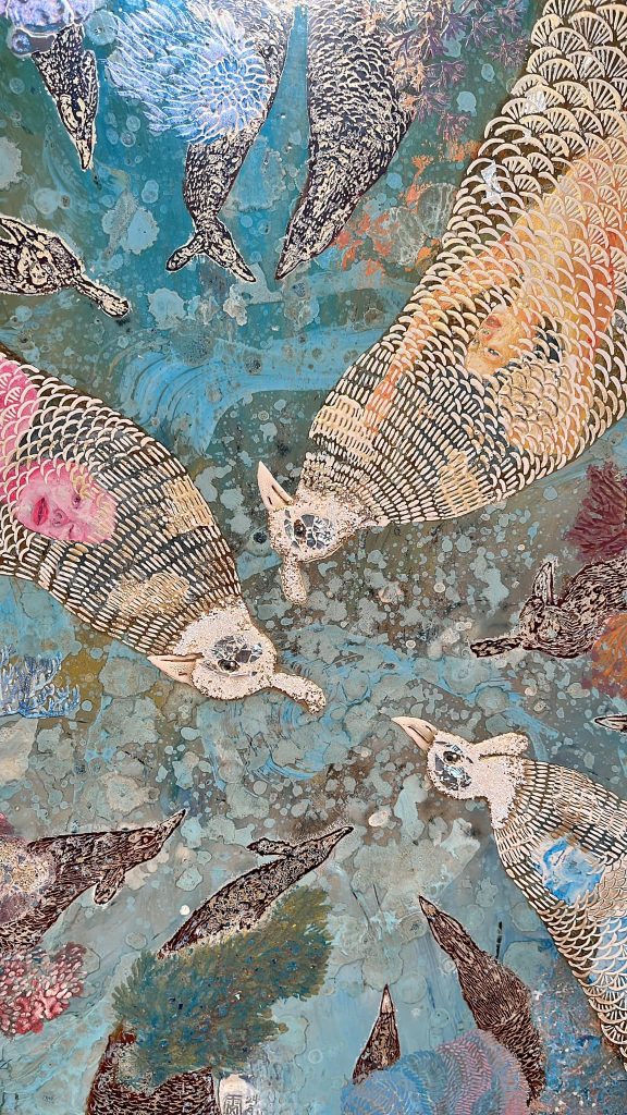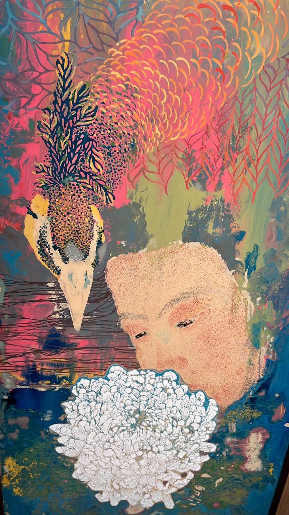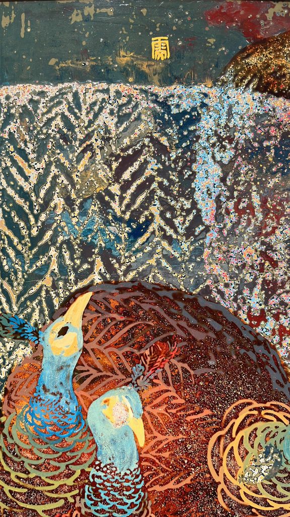 王雯的漆畫,彷彿讓人置身某種內心的風景。仔細觀賞慢慢堆疊出細膩又絢麗的畫面——像是描繪一段不語的「因緣」,亦或是記憶深處的一次情感重返。