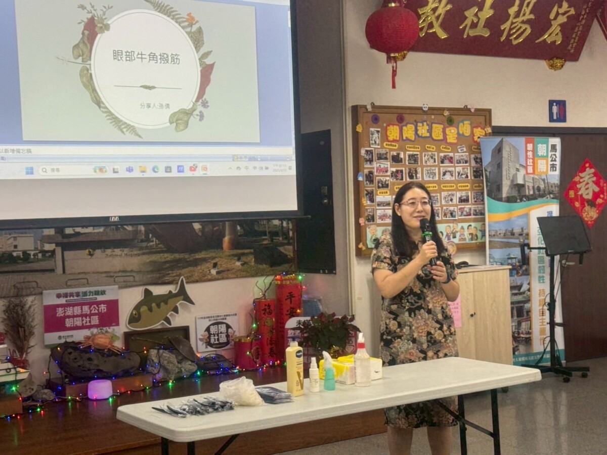 【記者 葉佳盈/澎湖 報導】移民署中區事務大隊澎湖縣服務站於4月23日在馬公市朝陽活動中心,辦理「眼睛牛角撥筋–家庭教育暨法令宣導課程」,邀請移民署多元文化講師孫倩分享來臺後的適應經驗,並教導實用的眼部保健以及牛角撥筋技巧,透過簡單的護眼操與牛角撥筋,舒緩眼部壓力、保持視力健康。