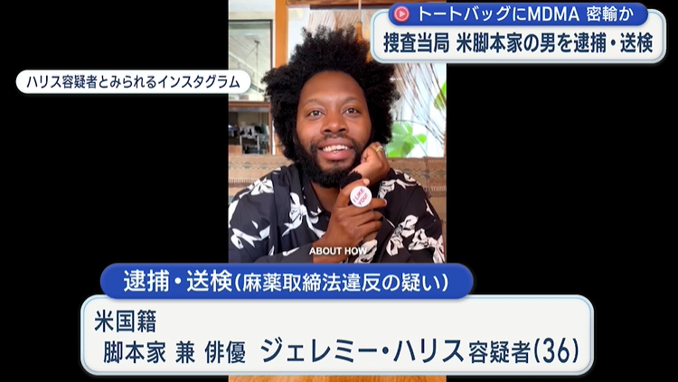美國劇作家、演員、編劇36歲的傑里米·哈里斯 (Jeremy Harris) ,涉嫌走私合成毒品搖頭丸MDMA,在沖繩那霸機場遭逮捕。